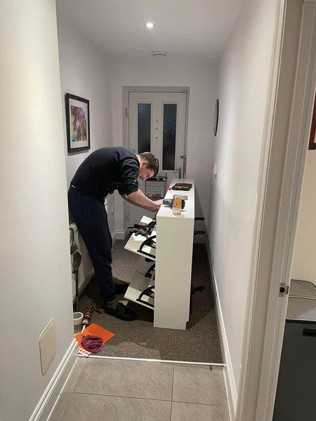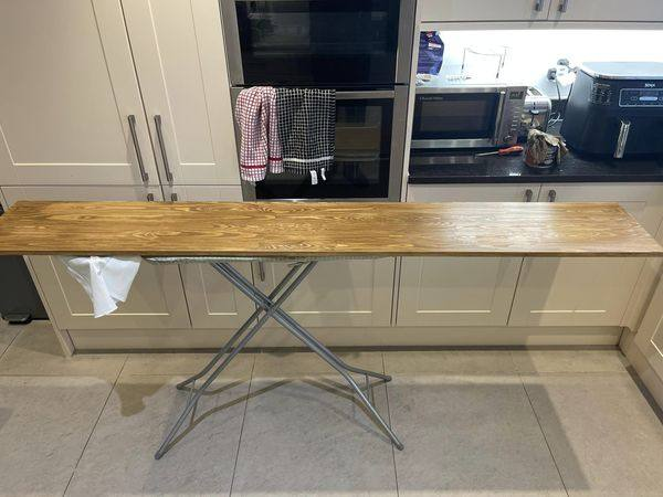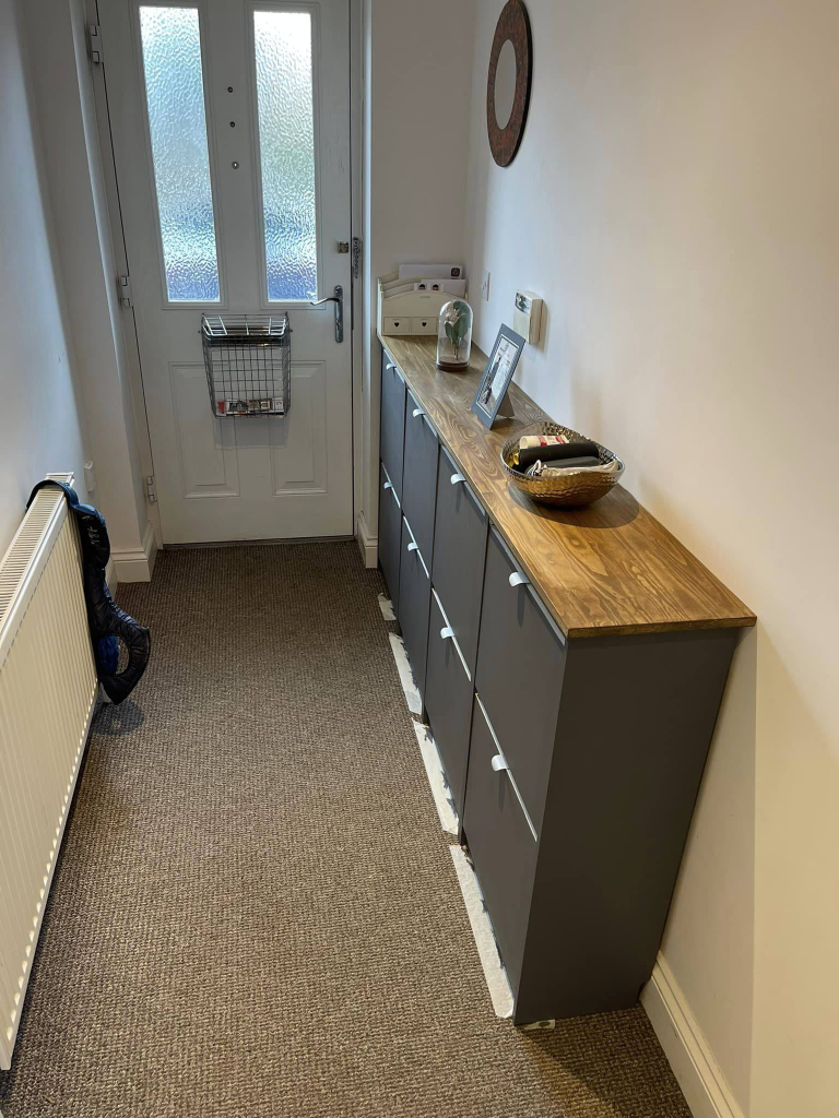 The stained wooden top completes the transformation. Its warm grain balances the cool white body and brings an inviting, classic touch. As a result, the hallway gains both style and purpose, becoming a place where beauty and function meet effortlessly.