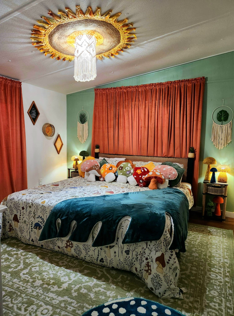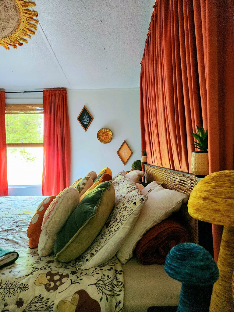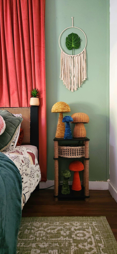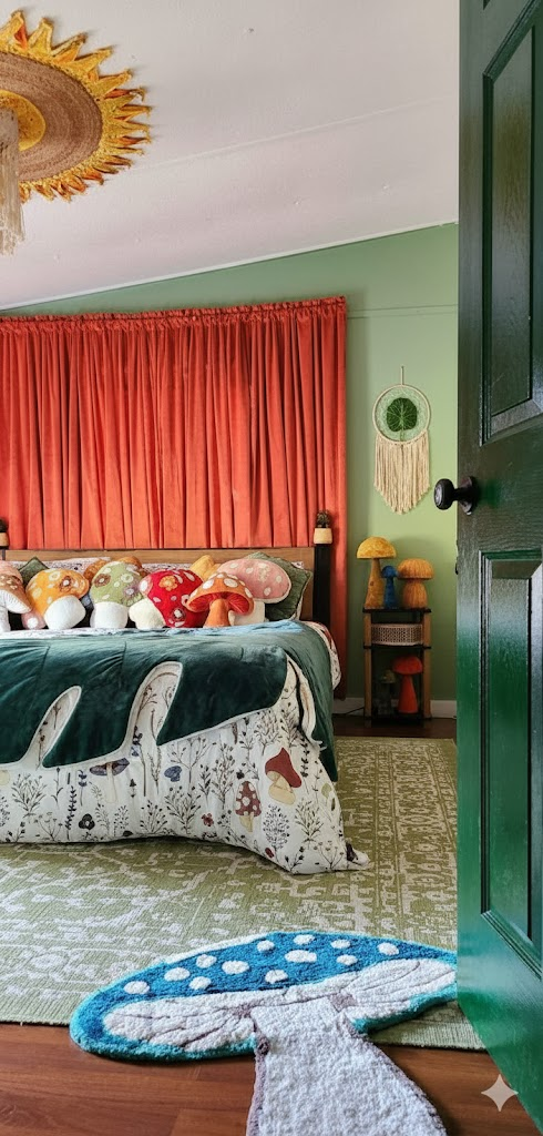 Rich coral curtains, soft green walls, and whimsical mushroom accents give this colorful summer bedroom an expressive, sunlit charm. The woven textures, handcrafted details, and playful décor create a cheerful atmosphere that feels both nostalgic and refreshingly modern.