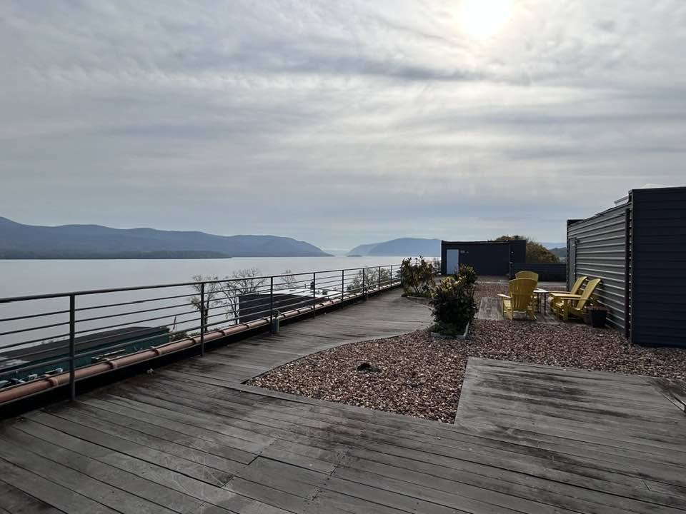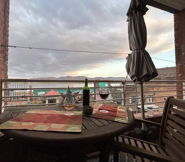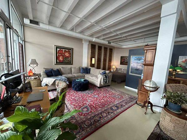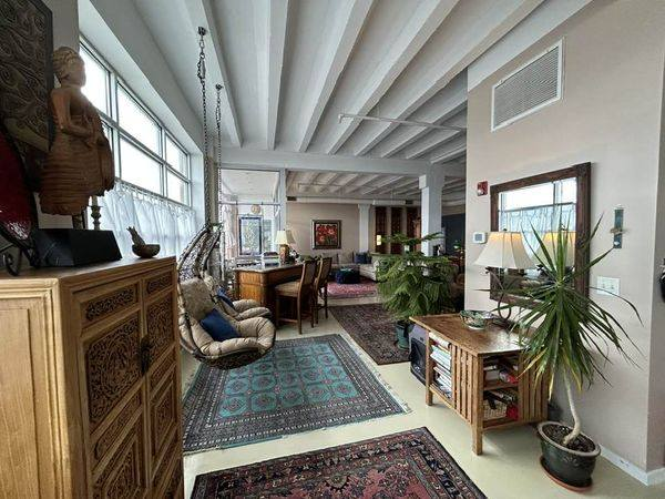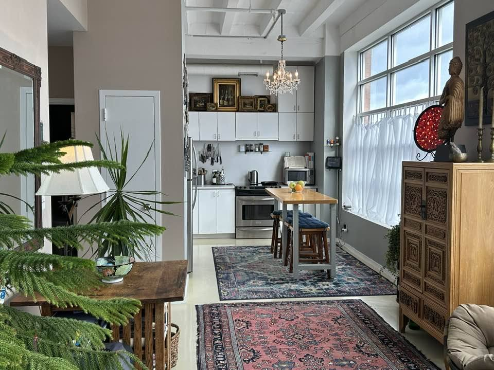 Soft natural light pours through expansive windows, revealing layered textures, vintage rugs, and worldly accents. The eclectic loft home inspiration shines in every corner, blending warmth, culture, and an inviting openness. Even the river beyond the balcony feels like part of the home’s gentle rhythm.