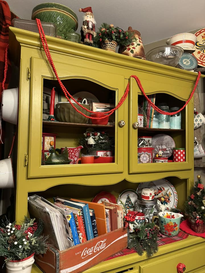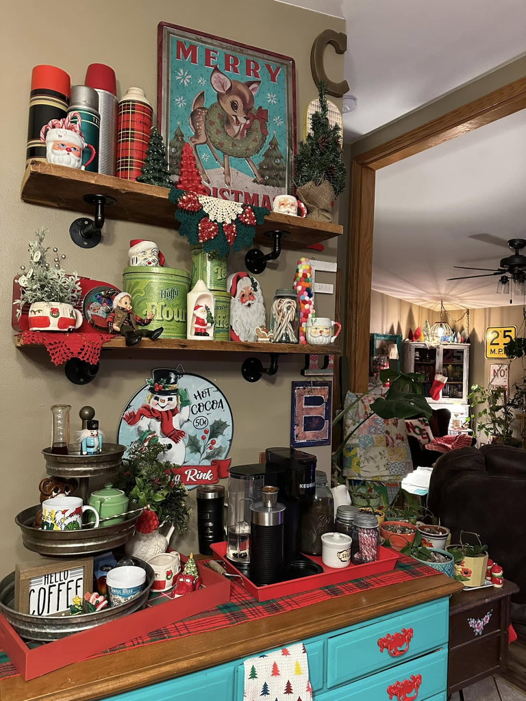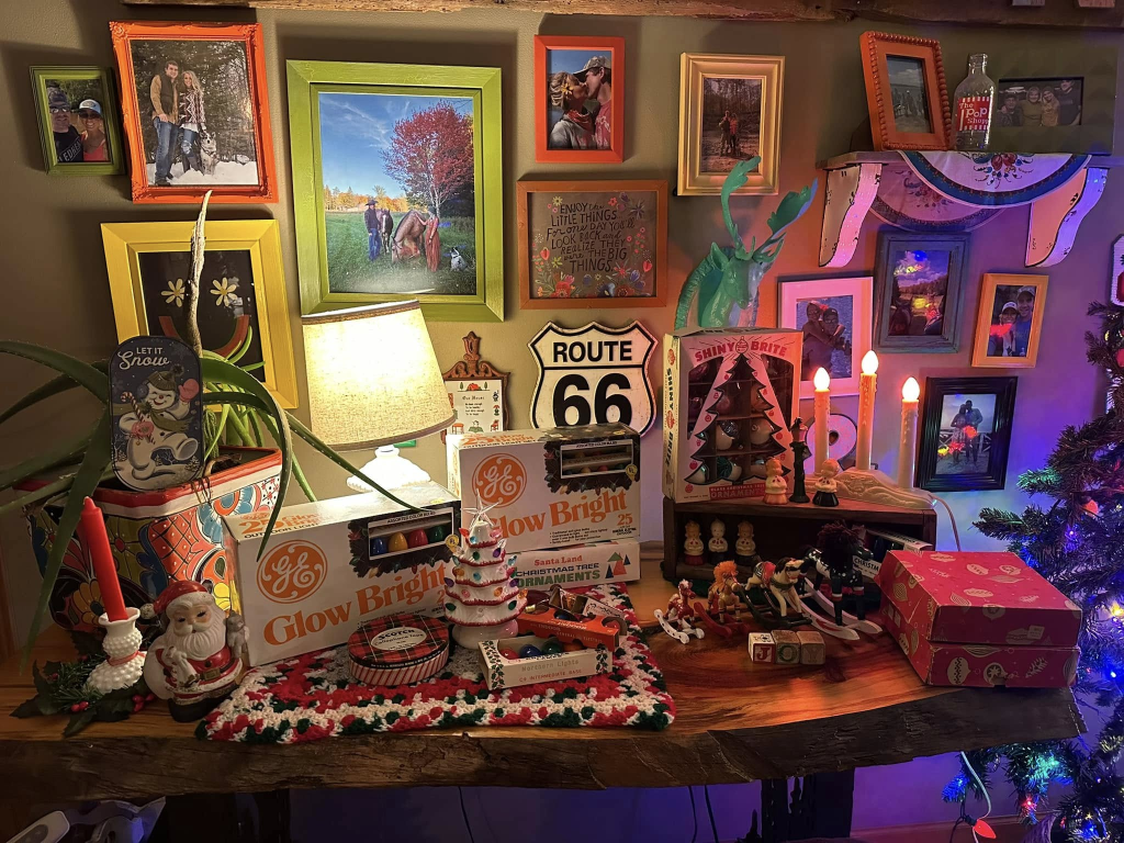 Warm lighting glows against walls brimming with artwork, sentimental signs, and vintage curiosities. A vivid Christmas tree, drenched in jewel-toned lights, anchors the room with holiday cheer. In this colorful Christmas Hampston home tour, every shelf and vignette feels like a tiny story—collected, cherished, and celebrated.
