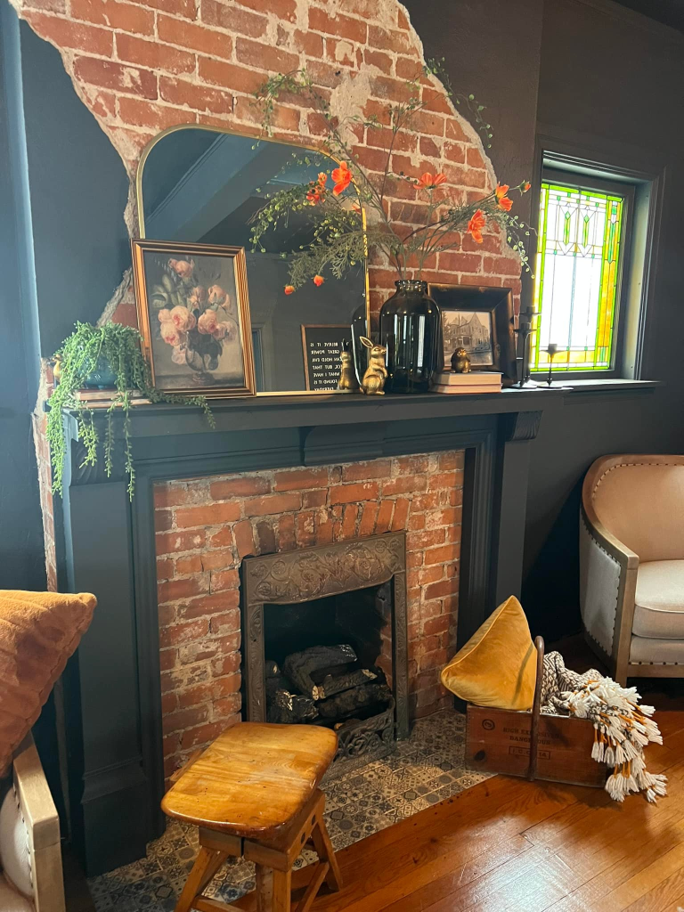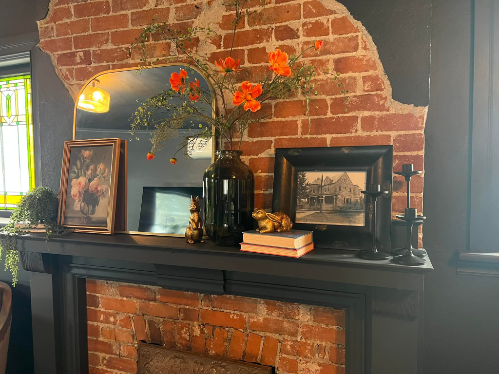 The Victorian spring fireplace charm deepens as one notices the exposed brick arch—its imperfect silhouette glowing against deep charcoal walls. Frames, books, and a vintage photograph of the home itself rest gracefully on the mantle, creating a vignette that feels both personal and beautifully timeless.
