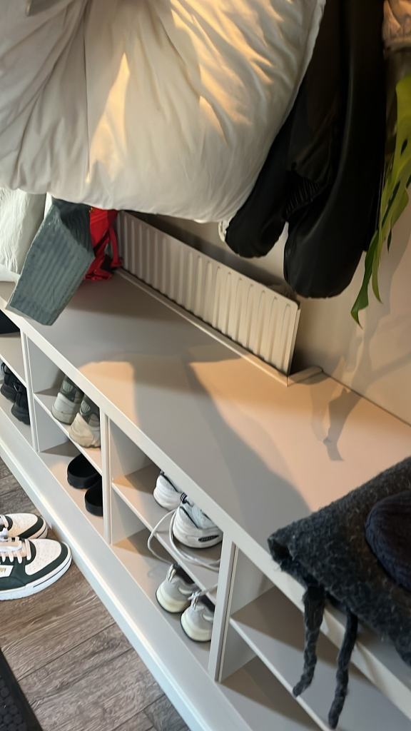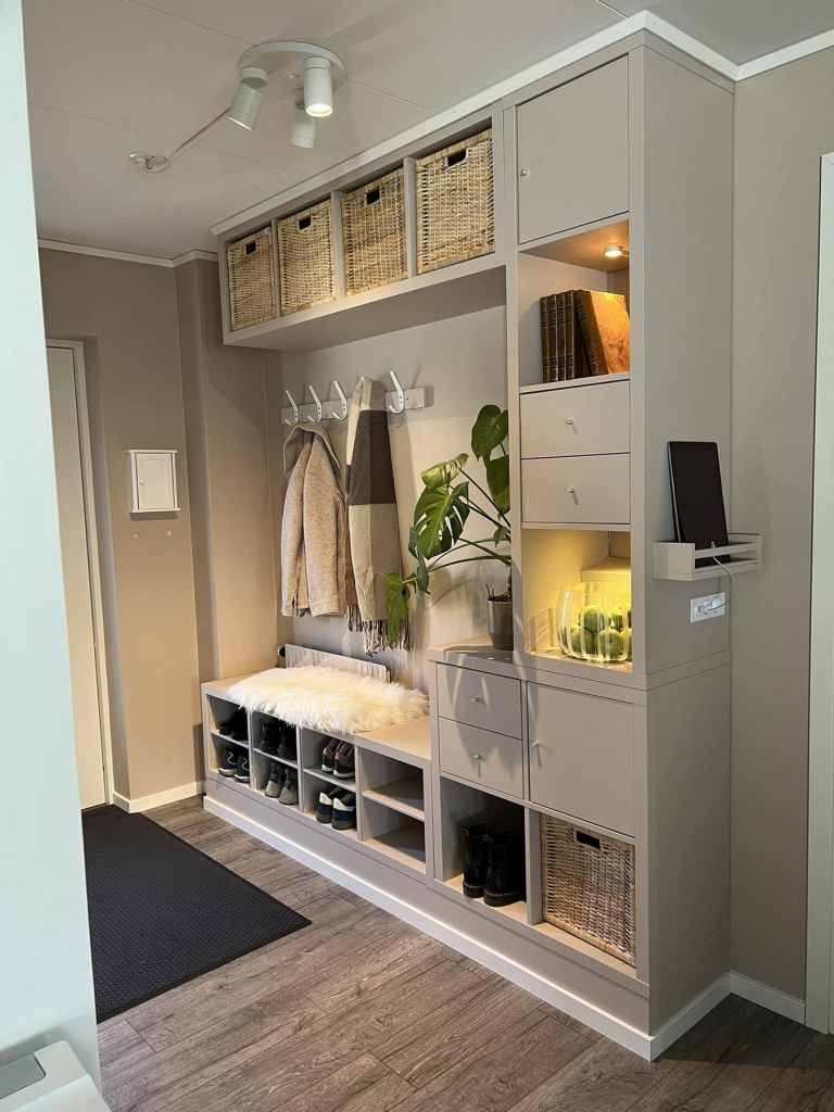 This setup includes Kallax shelves, LED lighting, and hidden power. It also provides space for shoes, coats, and daily accessories. Because of this, the hallway stays clean and easy to use every day .